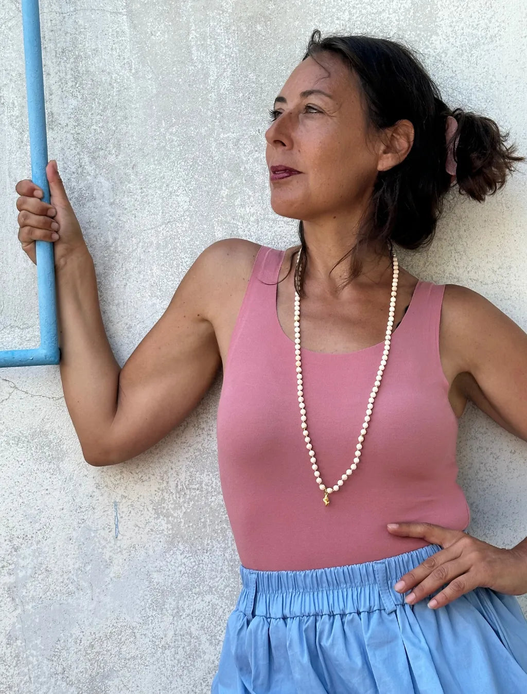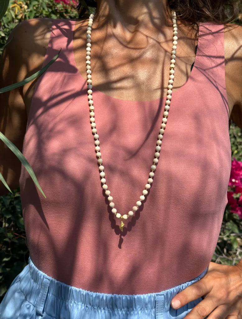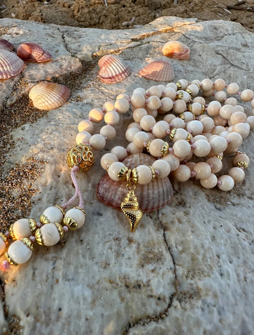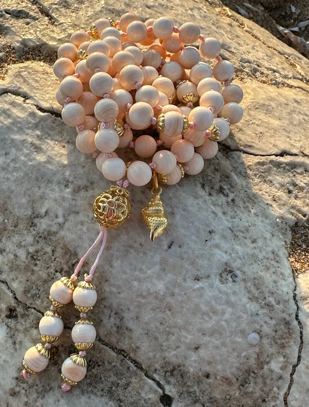 È composta da 108 grani di conchiglia rosa naturale, pietre delicate che custodiscono l’energia del mare e del cuore. Donano calma alle emozioni, aprono all’ascolto profondo e favoriscono gentilezza e sensibilità.