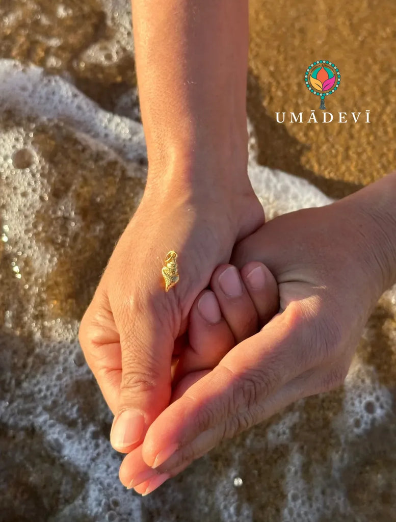 Il suo cuore è un piccolo pendente śaṅkha in argento dorato: un richiamo alla conchiglia sacra che, nella tradizione, diffonde il suono primordiale della creazione e simboleggia purificazione, protezione e risveglio interiore.
