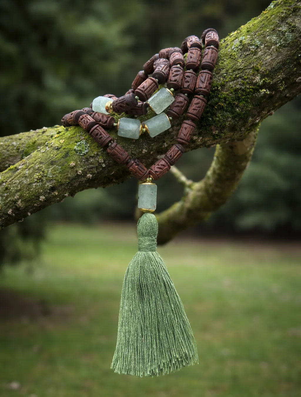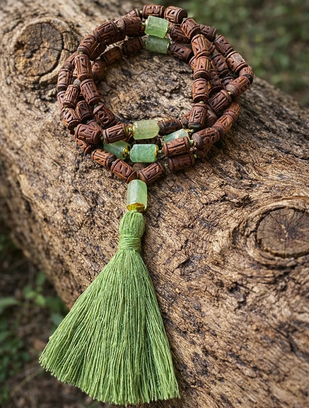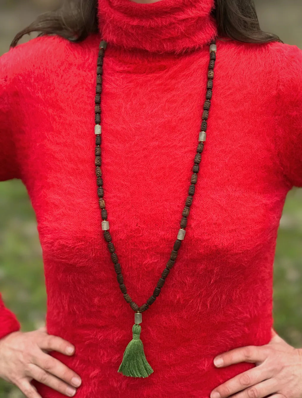 Questa japamālā è realizzata con grani cilindrici di legno di Tulsi, una pianta sacra della tradizione indiana, conosciuta come basilico sacro, da sempre associata alla devozione e alla protezione spirituale.