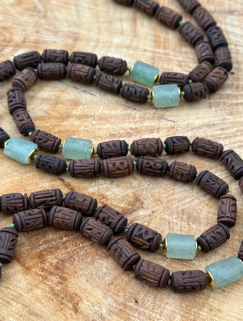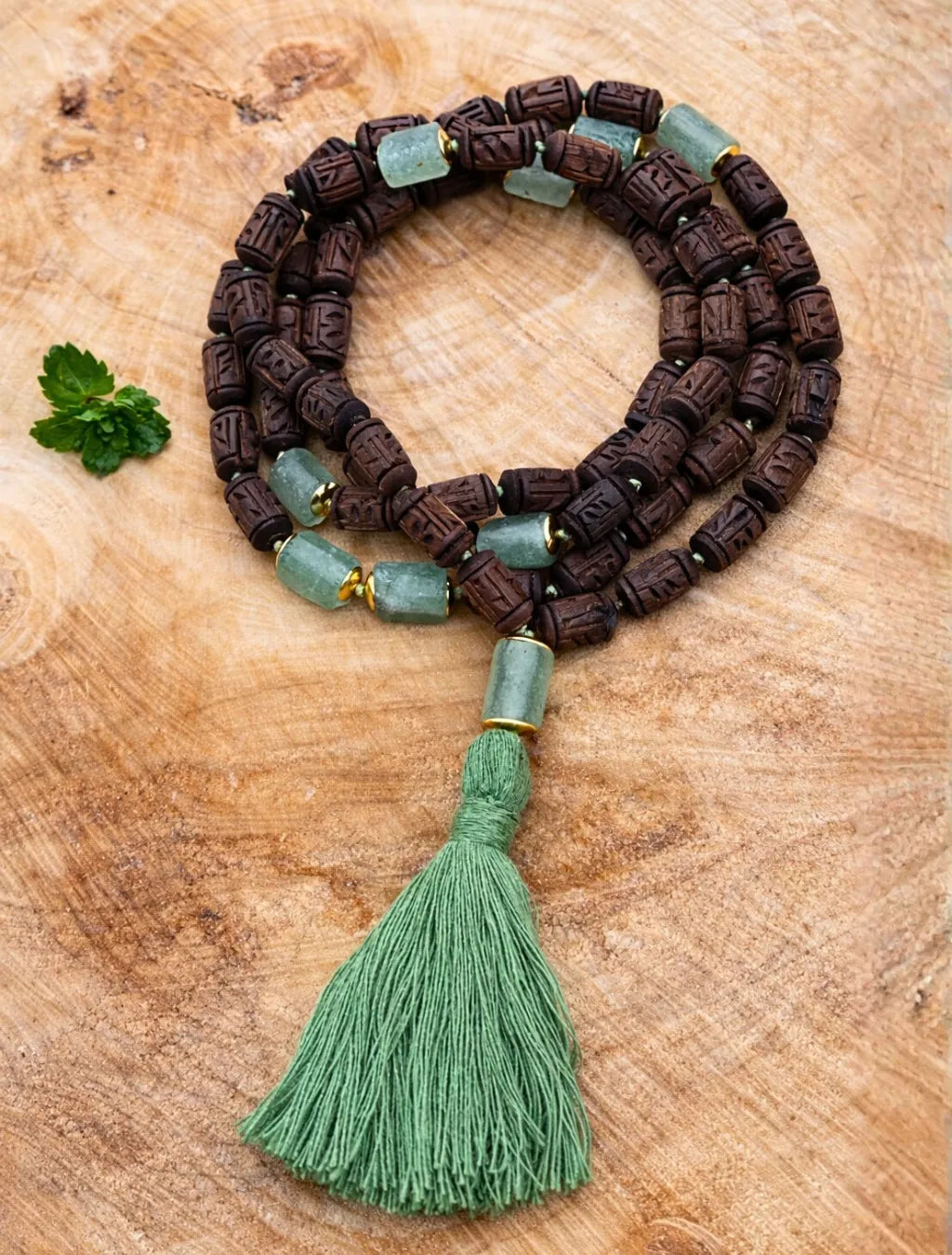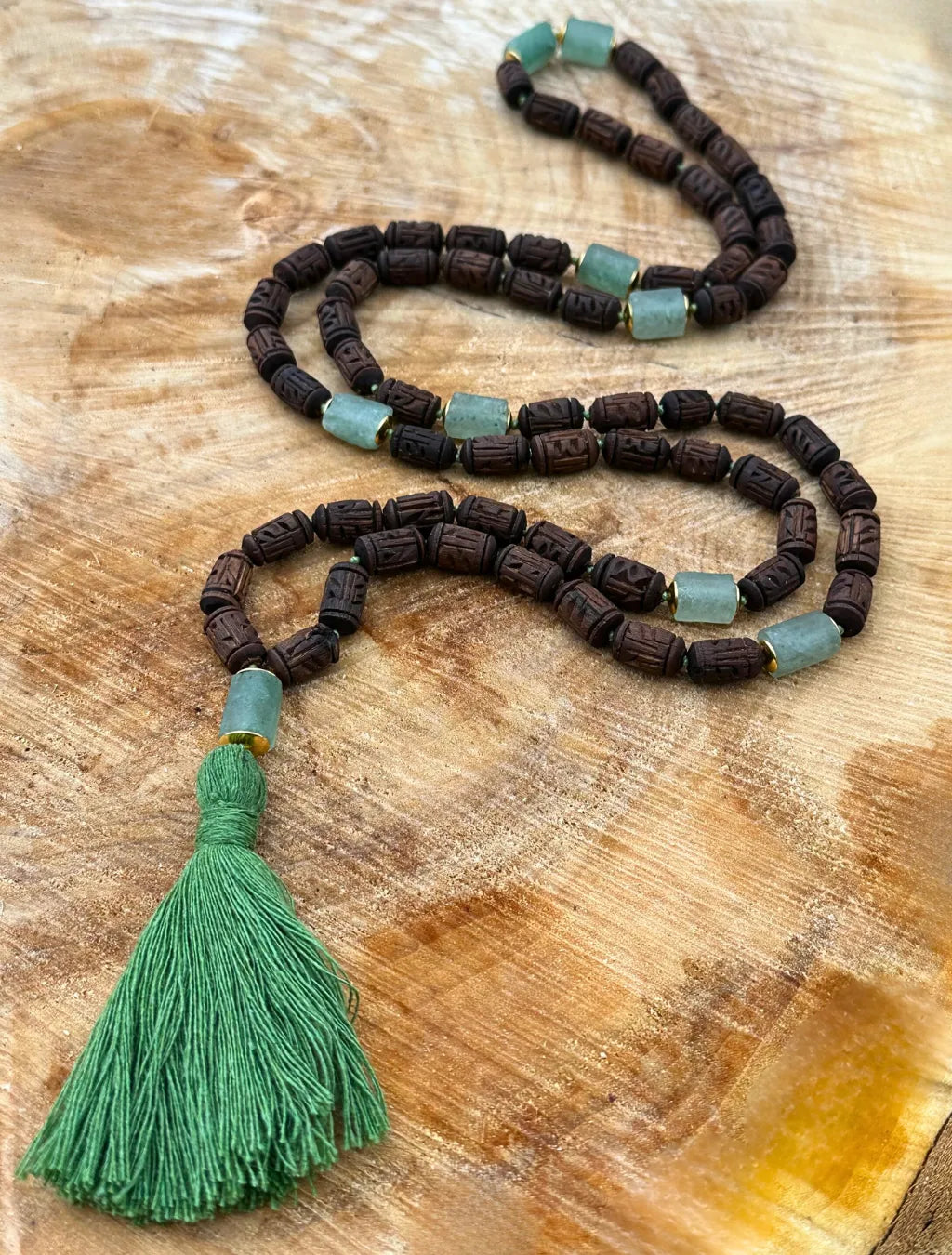 Questa japamālā è realizzata con grani cilindrici di legno di Tulsi, una pianta sacra della tradizione indiana, conosciuta come basilico sacro, da sempre associata alla devozione e alla protezione spirituale.
