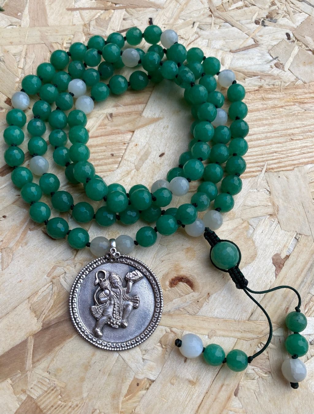 È una mālā creata con 108+1 con grani di Avventurina e Pietra di Luna sfaccettate e arricchita dal pendente argento Hanumān.
