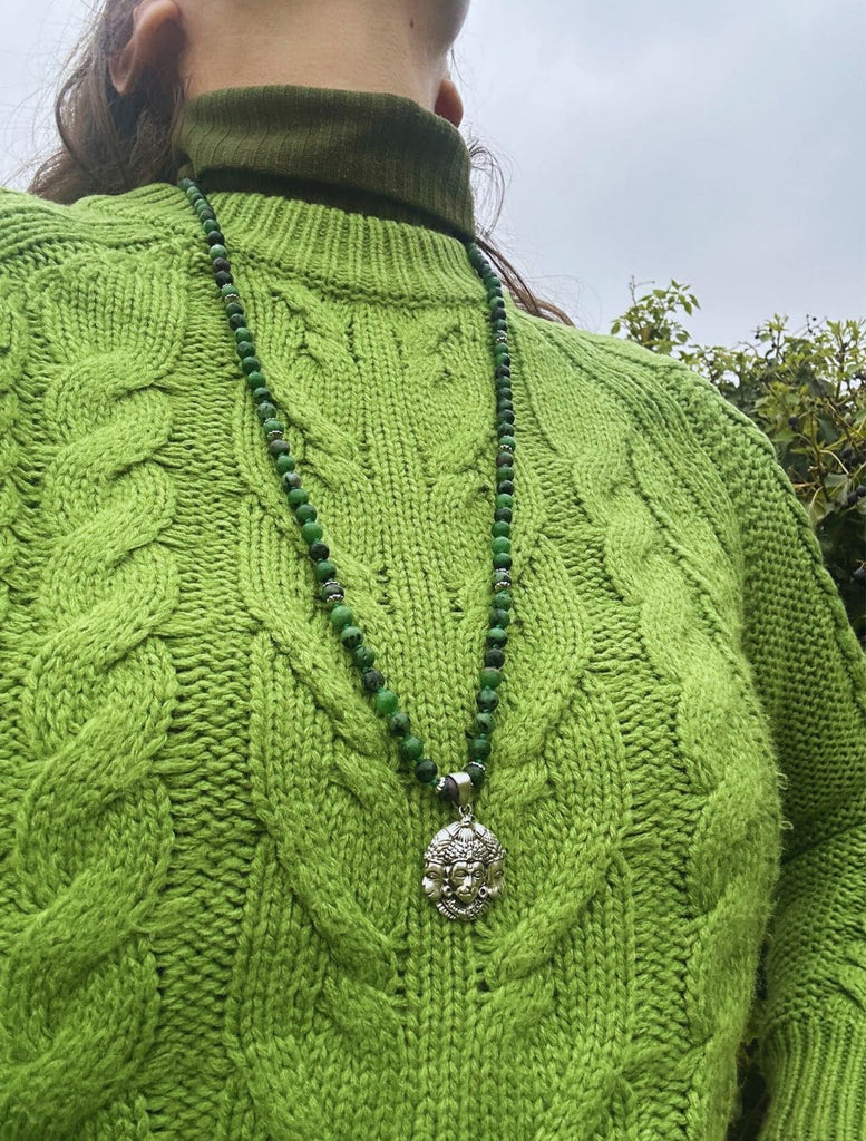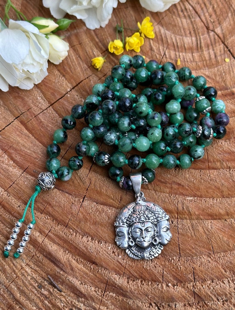 La mālā è composta da 108 grani di Zoisite, un pendente in argento che raffigura Hanumān, una perla guru lavorata in argento e piccoli dettagli metallici in argento.