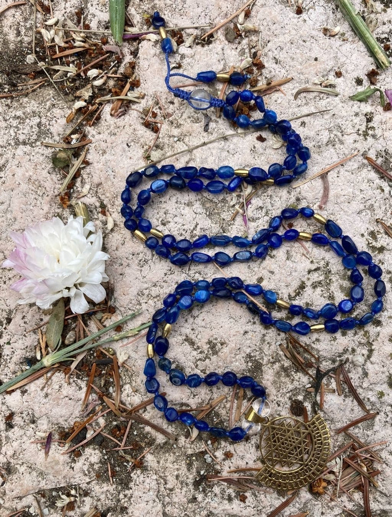 Questa mālā è composta da 108+1 sassolini di Cianite e Quarzo Ialino ed è arricchita dal pendente Śrīyantra in ottone, simbolo mistico di energia cosmica.