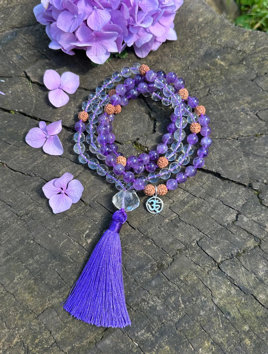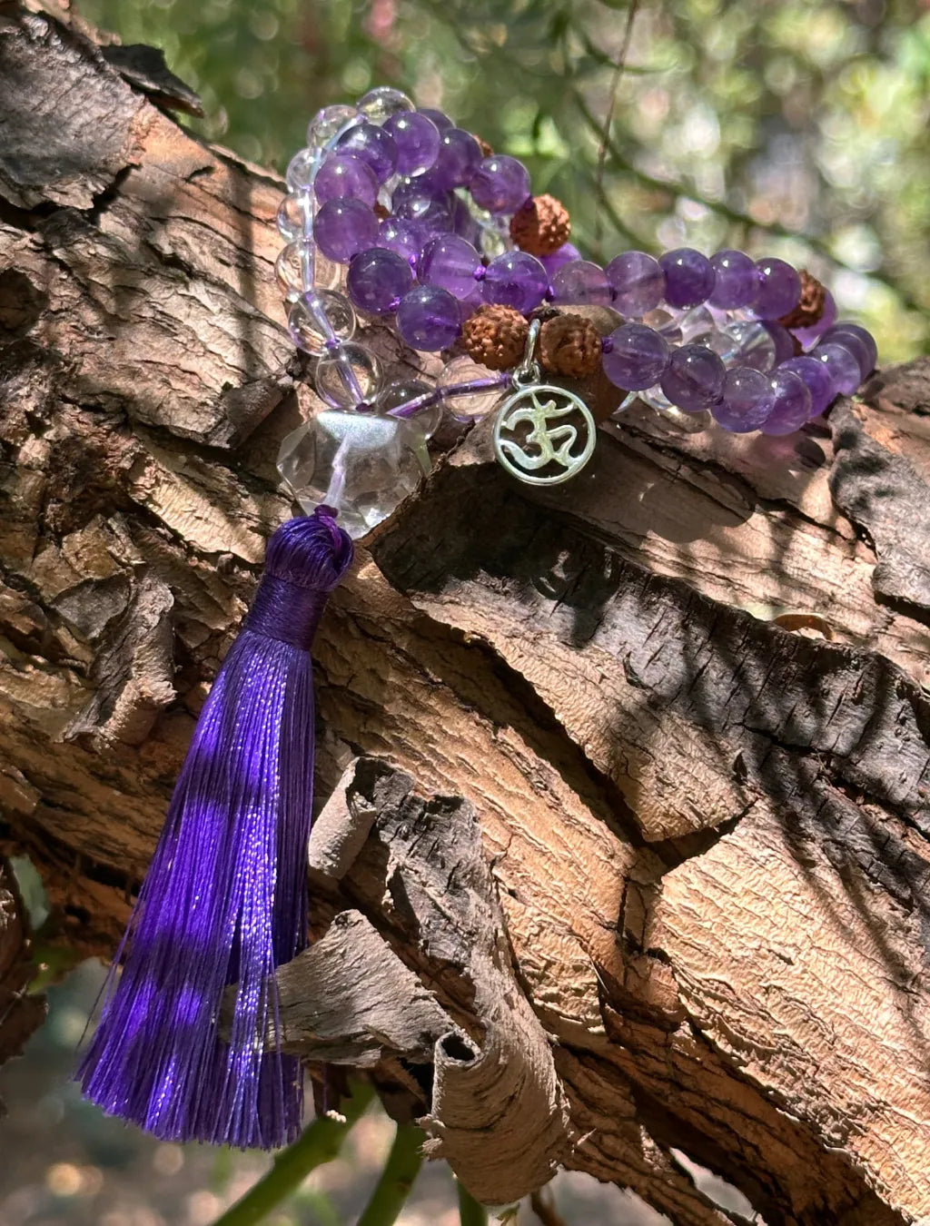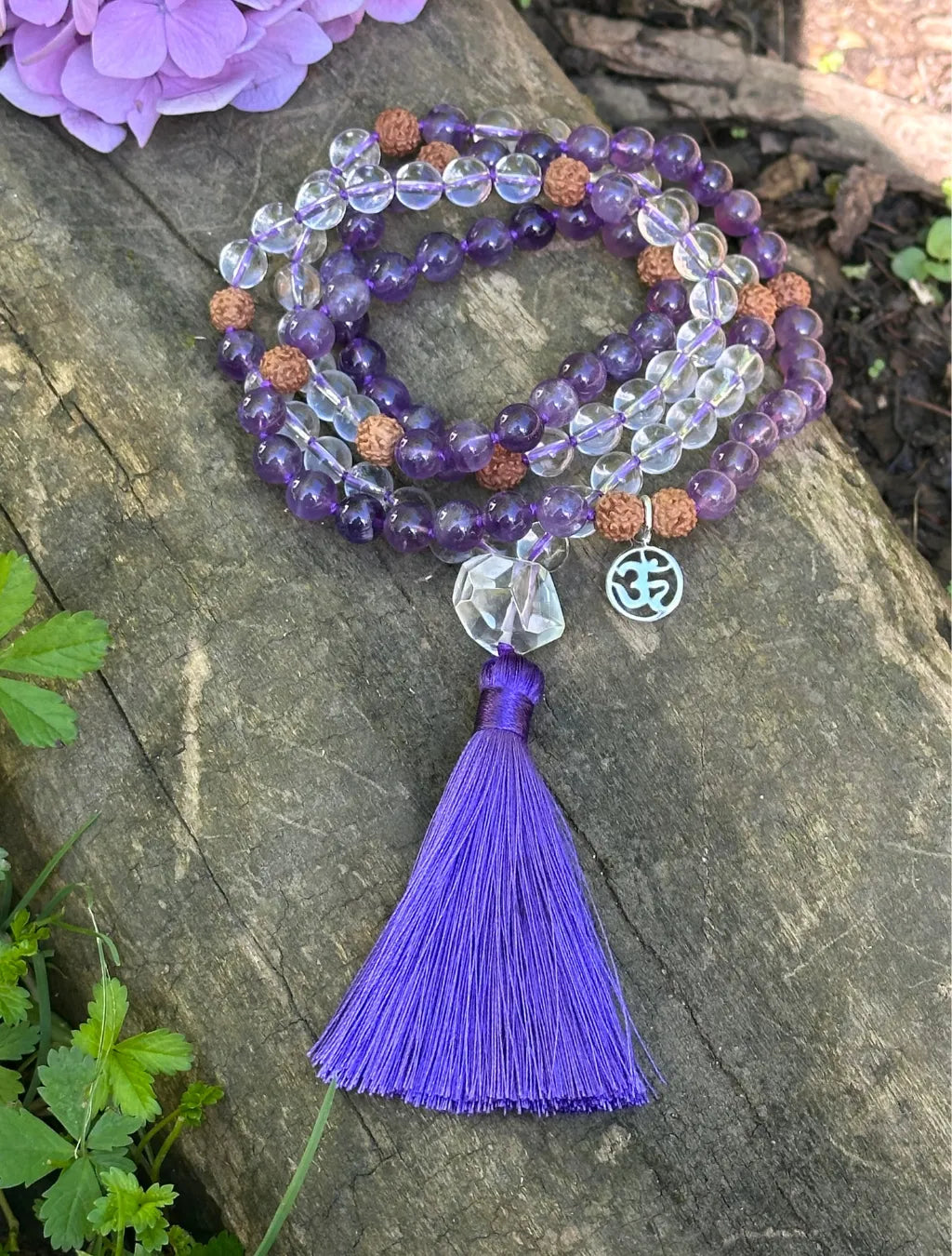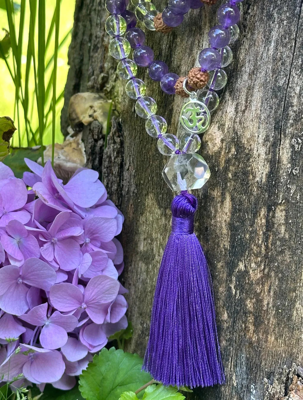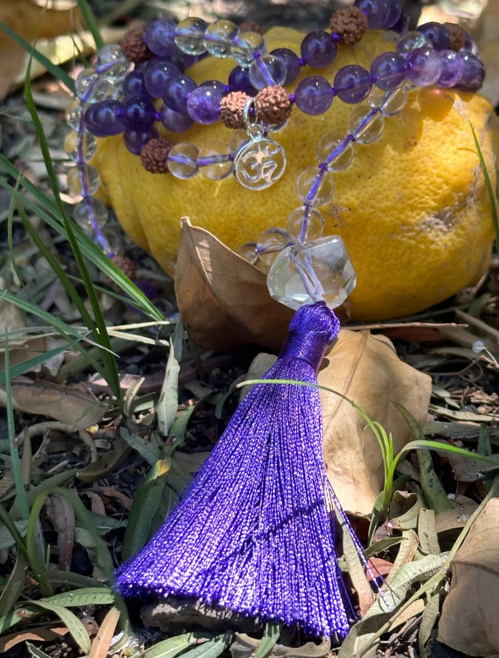 Una mālā da 108+1 grani di Ametista e Quarzo Ialino, con pietra guru in Quarzo Ialino, sacri semi di Rudrākṣa, nappina viola e pendente in argento raffigurante il simbolo della sacra sillaba Oṃ.