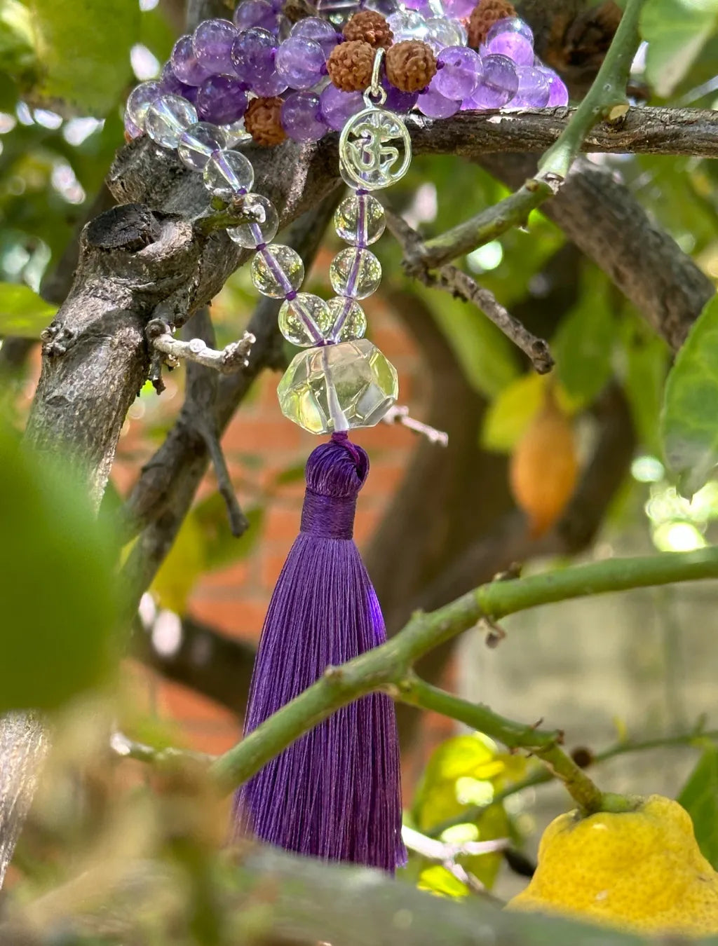 Le proprietà combinate di Ametista, Rudrākṣa e Quarzo Ialino rendono questa mālā un potente strumento per la meditazione e la recitazione dei mantra.