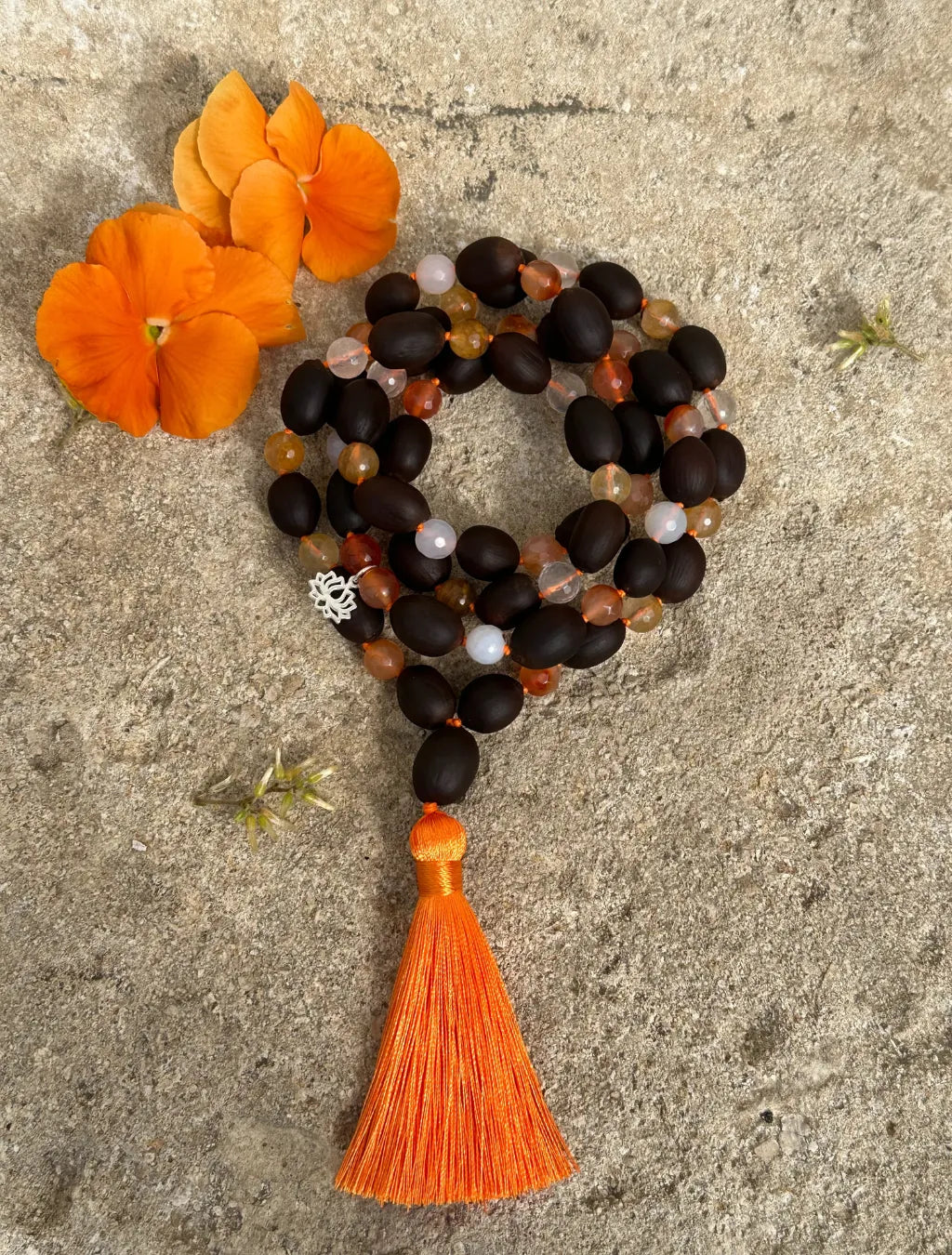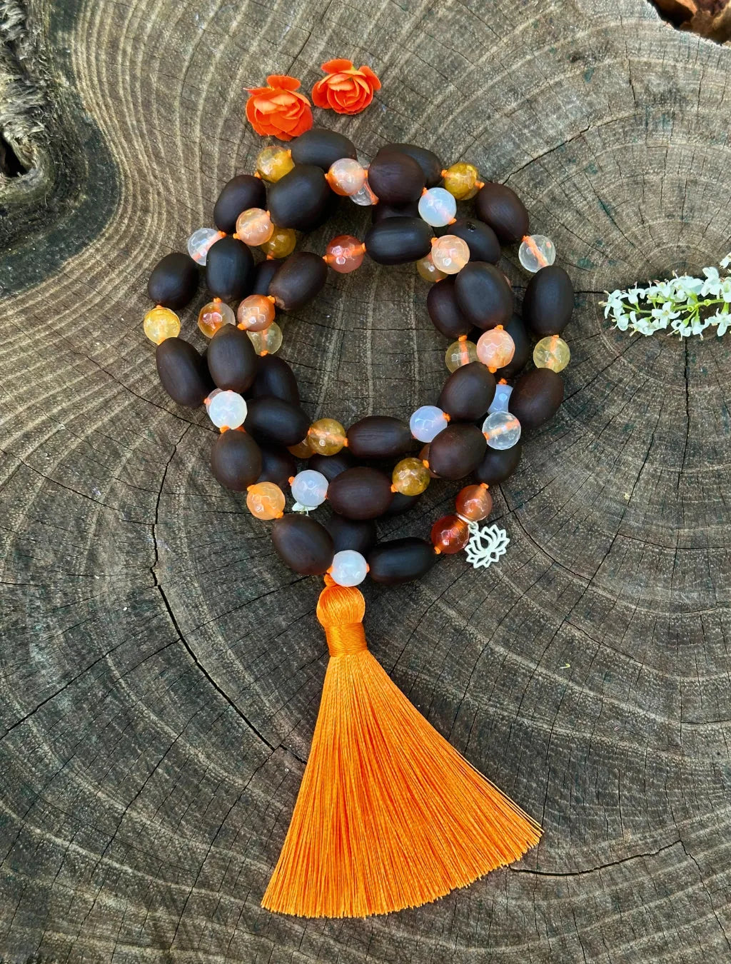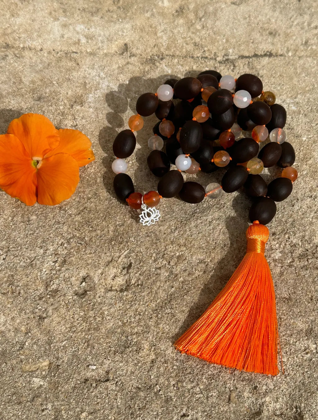 Questa japamālā da 72+1 grani alterna semi di Fiore di Loto, Corniola e Quarzo, ed è arricchita da un piccolo pendente a fiore di loto in argento e da una morbida nappina arancione.