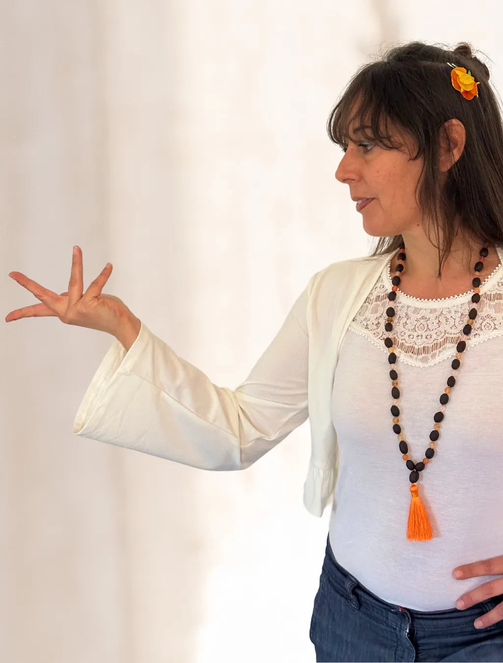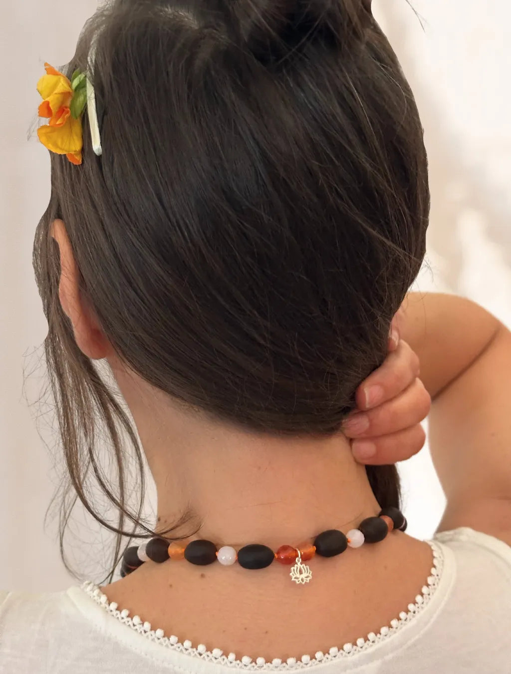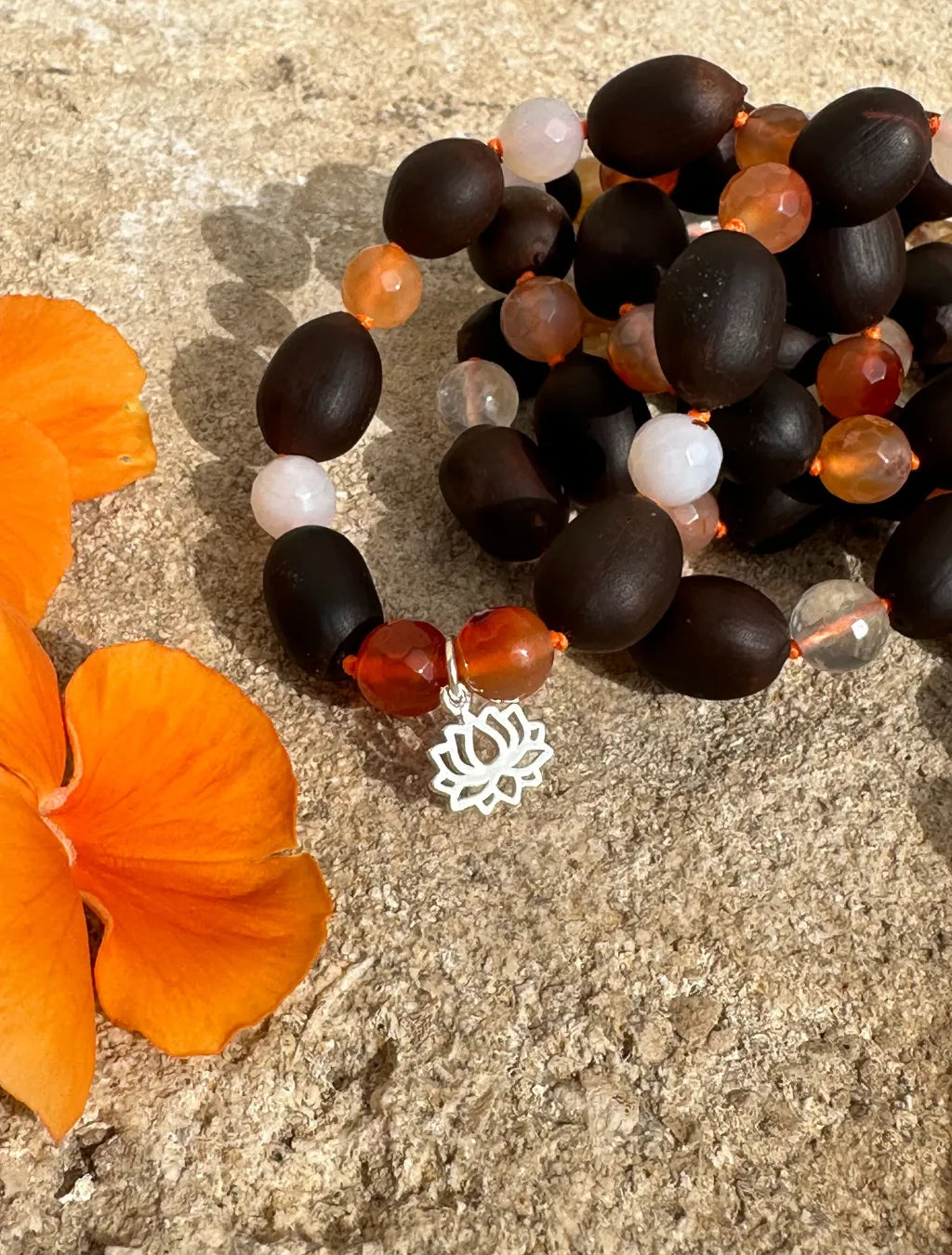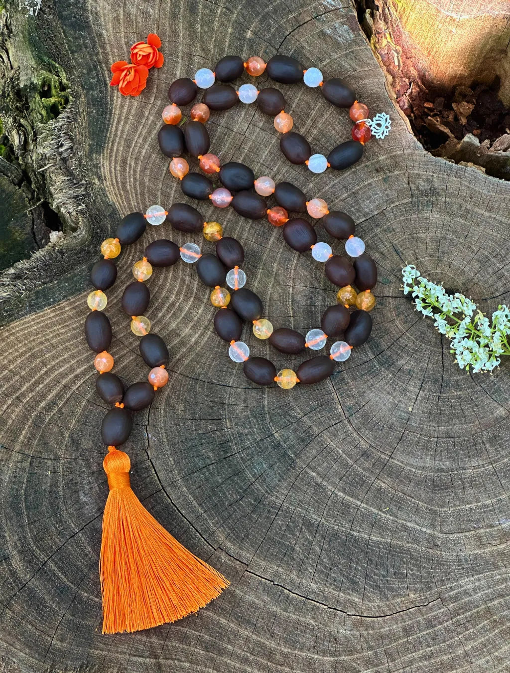 Questa japamālā da 72+1 grani alterna semi di Fiore di Loto, Corniola e Quarzo, ed è arricchita da un piccolo pendente a fiore di loto in argento e da una morbida nappina arancione.
