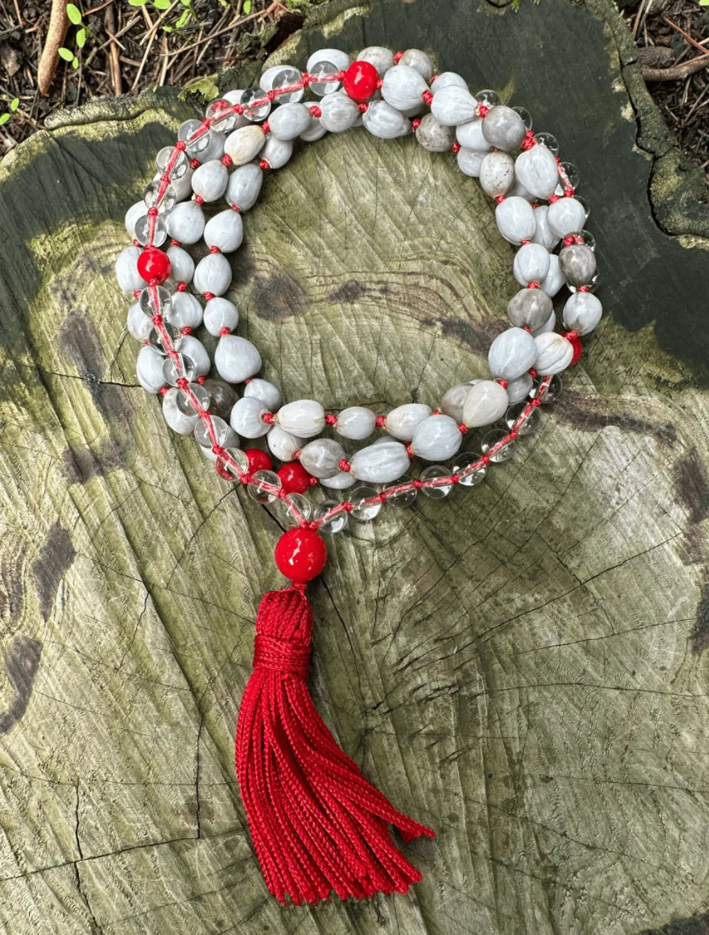 L’incontro di questi elementi dona a questa mālā una vibrazione di positività, purezza ed equilibrio, rendendola una compagna preziosa per la meditazione, il japa e il cammino interiore.