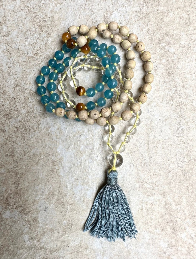 Mālā composta da 108+1 grani di Angelite, Tulsī, Quarzo Ialino e Occhio di Tigre, con una nappina morbida celeste.