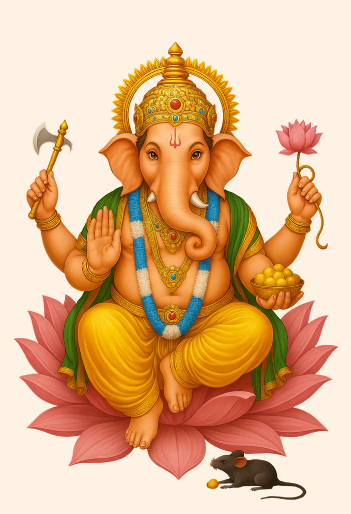 Gaṇeśa è il deva dell’intelletto e della saggezza. Noto anche come Gaṇapatī, [dal sanscrito “gaṇa” che significa “gruppo”, “moltitudine” o “categorie” e “īśa” che significa “signore o maestro”] è il “Signore dei Gaṇa”, il “Signore delle moltitudini”, il “Signore di tutti gli esseri”, il “Signore delle categorie. Tra i suoi epiteti “Vināyaka”, “colui che rimuove” e “Vighneśvara”, “il Signore degli ostacoli” che ne evidenziano il ruolo di guida spirituale e protettore, capace di dissolvere le difficoltà e di aprire il cammino verso la conoscenza e la realizzazione del Sé.