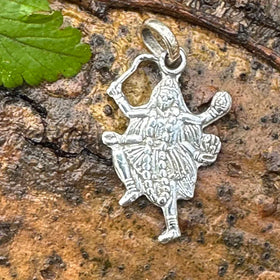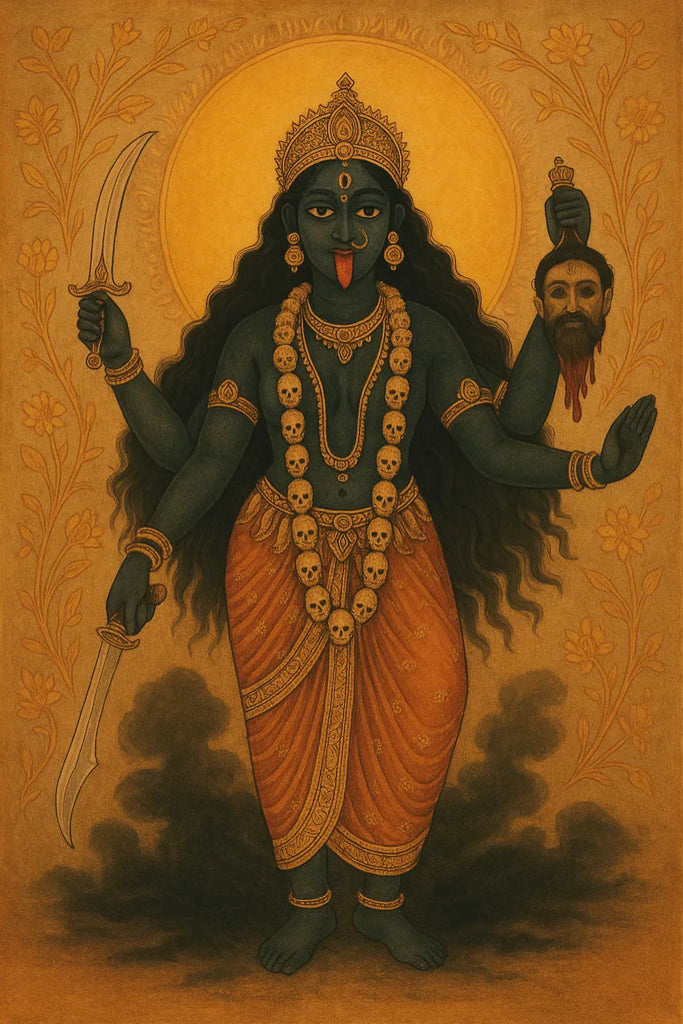 Kālī è la devī combattiva e feroce, l’incarnazione della distruzione che porta alla rinascita, la forza inarrestabile del tempo (kāla) che tutto consuma e tutto rigenera. Il suo aspetto terrificante è simbolo del suo ruolo cosmico: ella è la distruttrice dell’ignoranza, dell’ego e delle illusioni del mondo materiale, conducendo l’anima verso la liberazione.