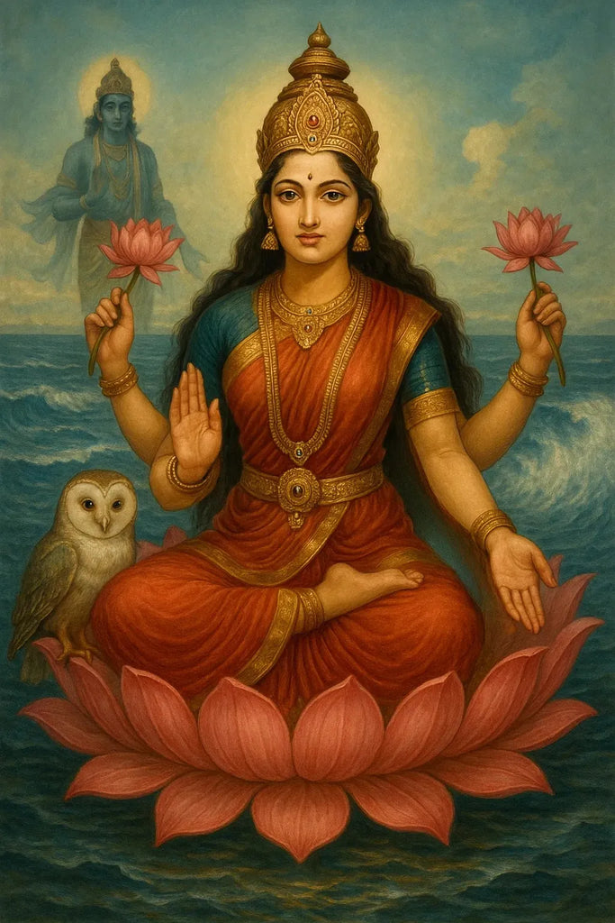 Spesso ci si rivolge a lei con l’epiteto di Padmā, che significa "fiore di loto", o con quello di kṣīrābhitanayā, che si traduce in "figlia dell’oceano di latte". Secondo il mito, Lakṣmī emerse dal rimestamento delle acque dell’oceano di latte (kṣīra-sāgara), un evento cosmico noto come Samudra Manthan. In questa mitologia, l’oceano di latte rappresenta la fonte della vita, e il suo rimestamento simboleggia la ricerca di saggezza e di cose preziose. Durante questo processo, Lakṣmī emerse come la manifestazione della perfezione, della bellezza e della prosperità.