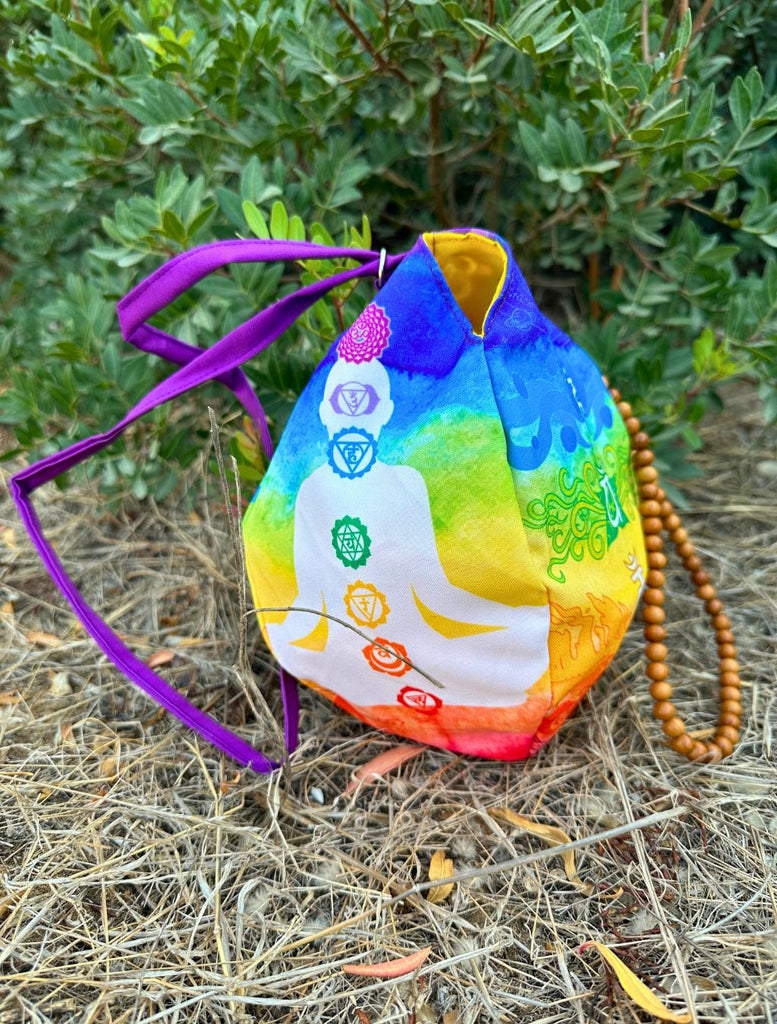 Questa speciale custodia, realizzata in morbido tessuto e decorata con la stampa dei chakra e delle corrispondenti lettere sanscrite, è ideale per accompagnare la tua pratica meditativa e proteggere la tua japamālā.