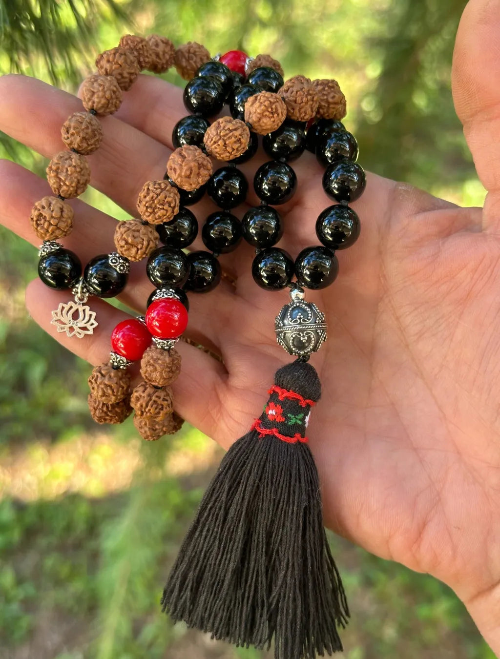 Mālā Mille Petali Loto | Onice, Corallo Bambù, Rudrākṣa