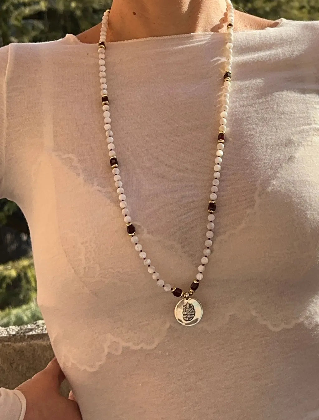 Il pendente in argento raffigurante Sarasvatī richiama la presenza costante del principio della conoscenza come guida silenziosa.