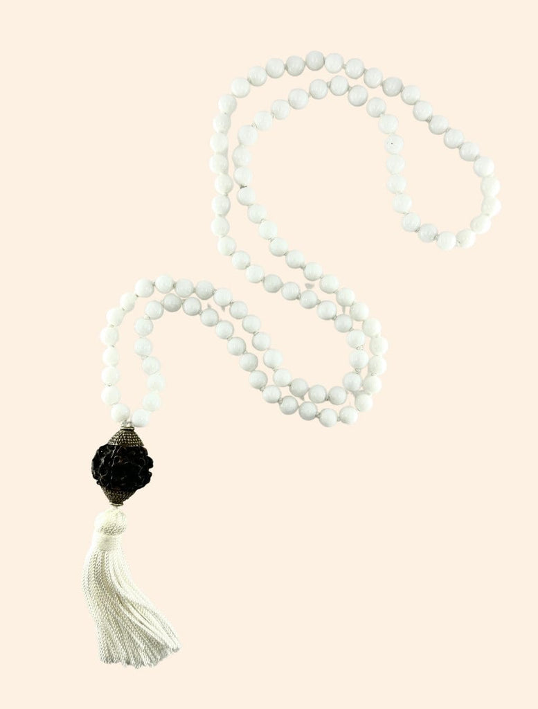 Questa mālā è composta da 108+1 grani di Agata bianca, da un guru - il grano centrale - di seme sacro di Rudrākṣa e da una nappina bianca.