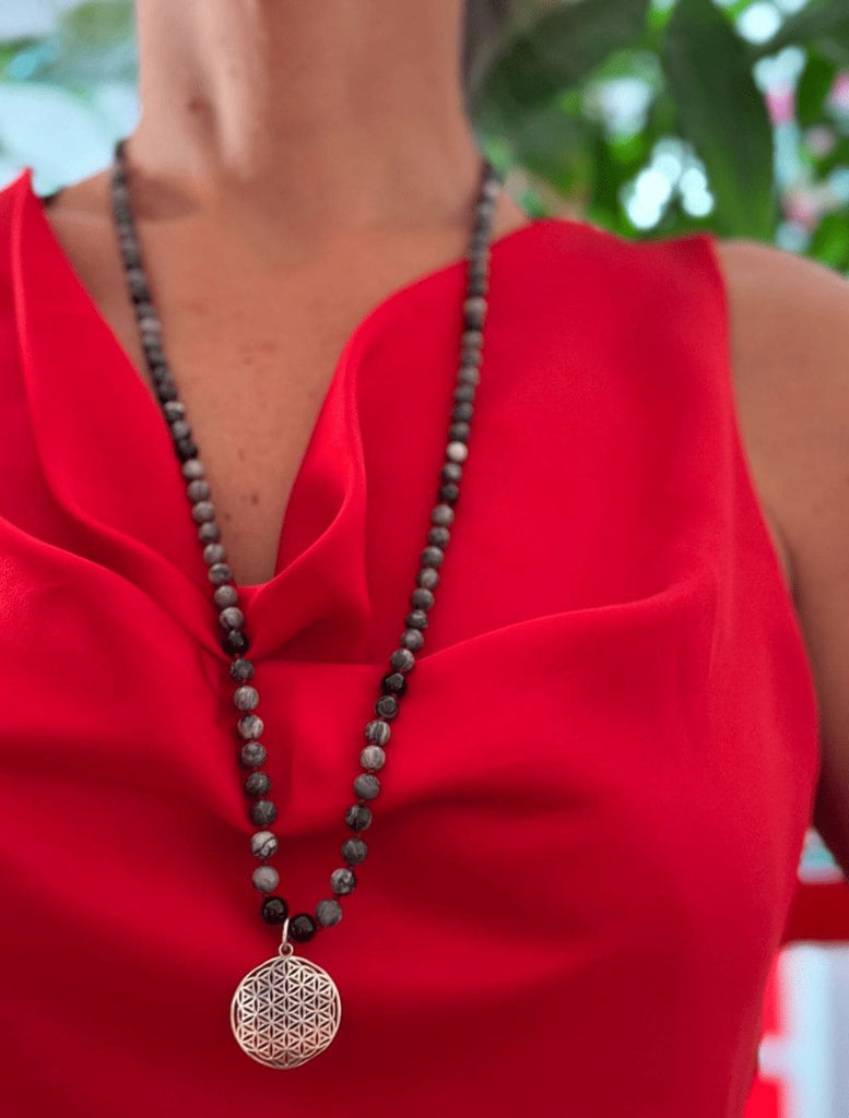 Mālā 108+1 grani di Diaspro e Granato con pendente argento raffigurante il Fiore della Vita e un guru, ovvero il grano centrale, in argento